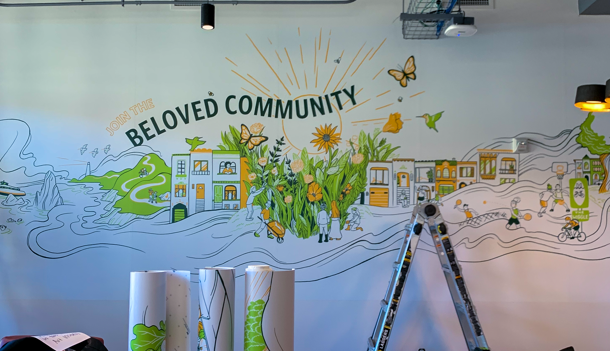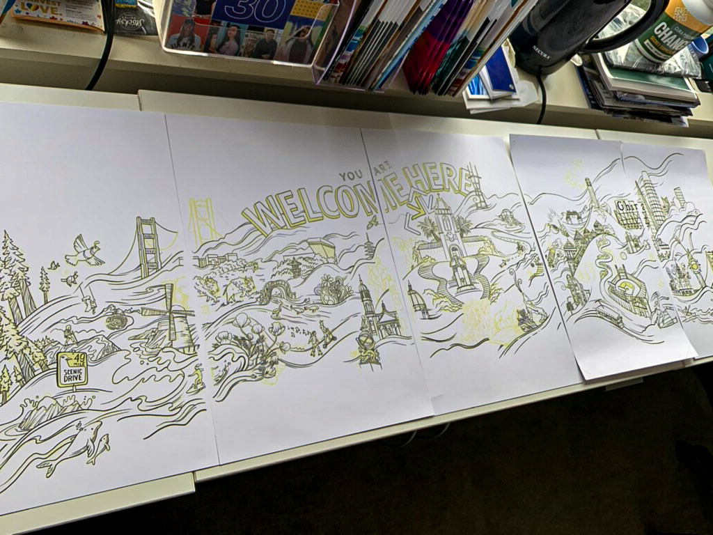 I was tasked with taking on the massive challenge of illustrating and designing a series of murals that would span over 100 feet of wall space. The artwork is intended to be viewed as one large, flowing piece composed of Bay Area landmarks, moments of community engagement, and messaging key to USF’s missions and values.