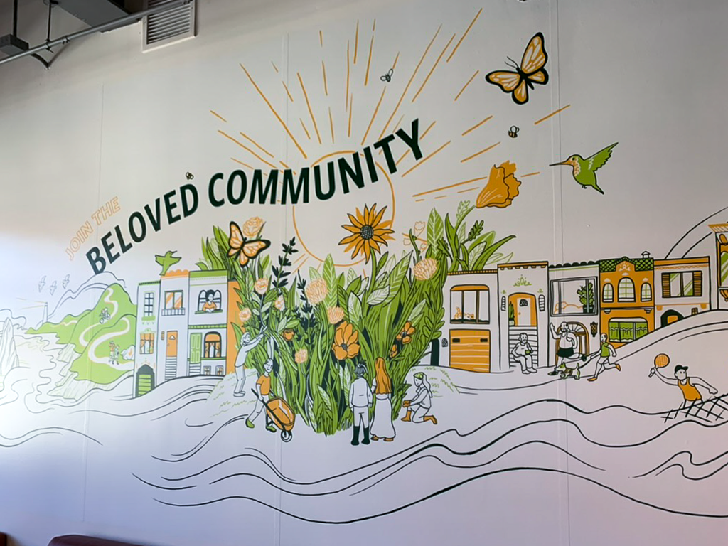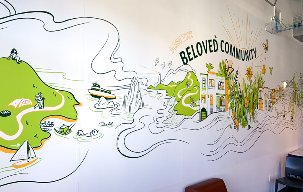 When a new campus extension was built, including a new dining hall, it provided an opportunity to brand the space with a mural that celebrated the diversity of the city and its neighborhoods. The dining hall, situated atop SF’s Lone Mountain, featured sweeping vistas of the city from the Pacific Ocean to the Bay.